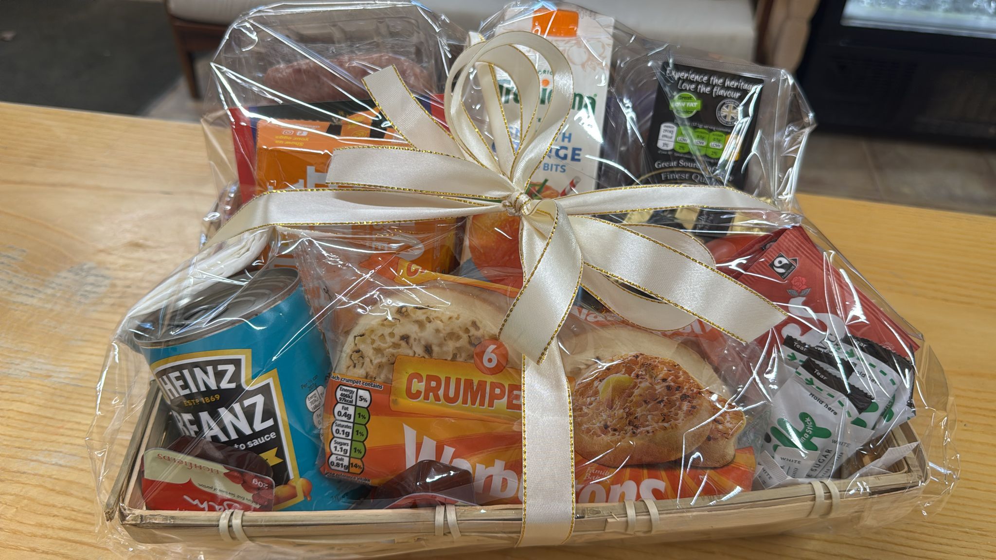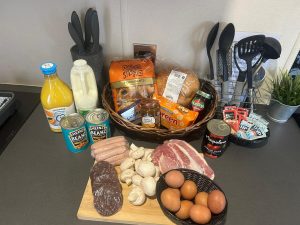 Sausage, bacon, eggs, beans, tomatoes, mushrooms, a bloomer, milk, orange juice, croissants.